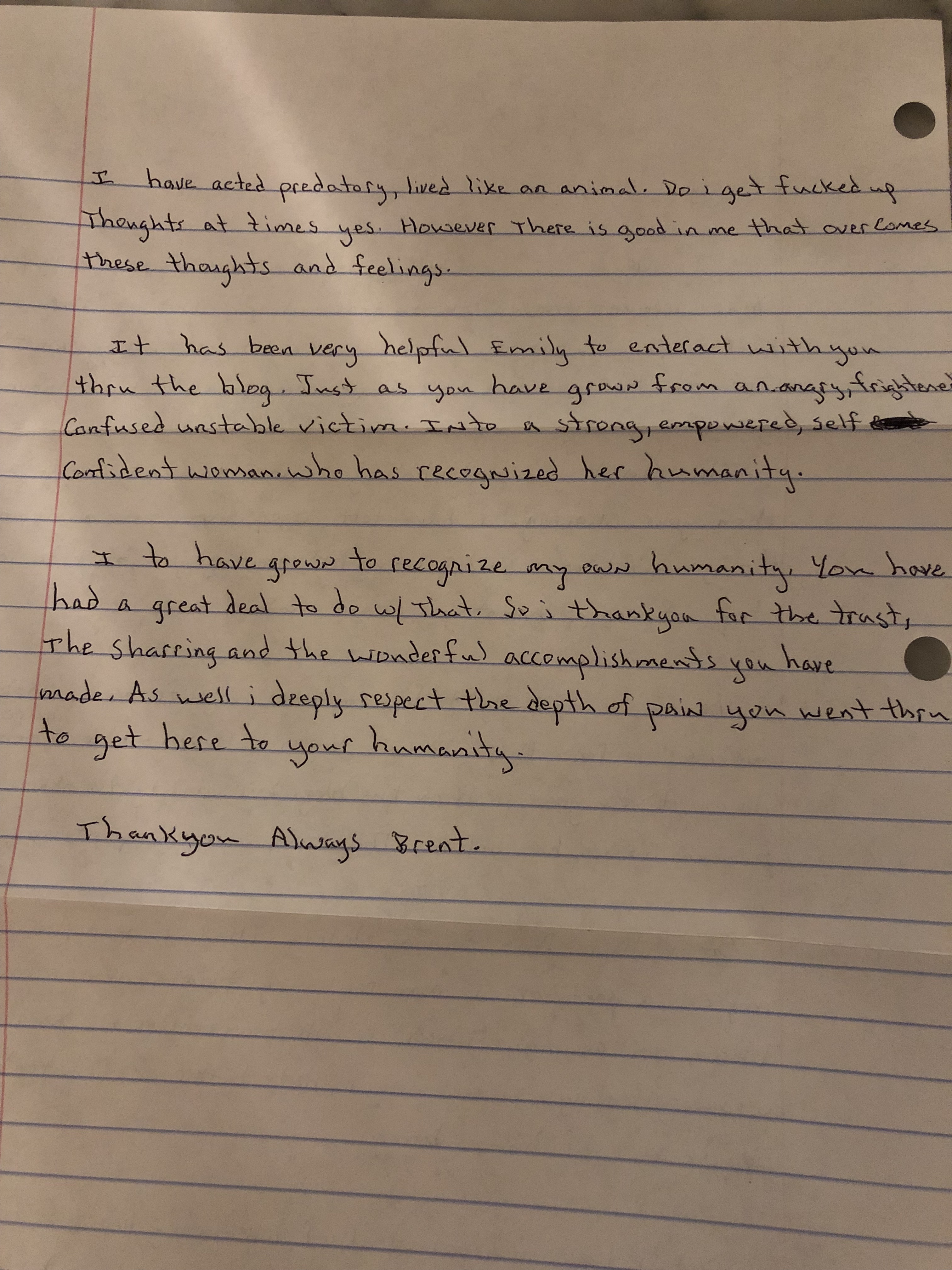 When I finished reading, something else remarkable occurred to me: that despite the geographical distance between you sat at your desk or on your bed/bunk (I imagine) and me sat here on this wooden chair in my kitchen, there is nothing between us as human beings. Nothing in the way. We have different stories, we made different choices, judgements, took different action.. etc.. but fundamentally we have the same narrative: to request to be simply seen for who we are.