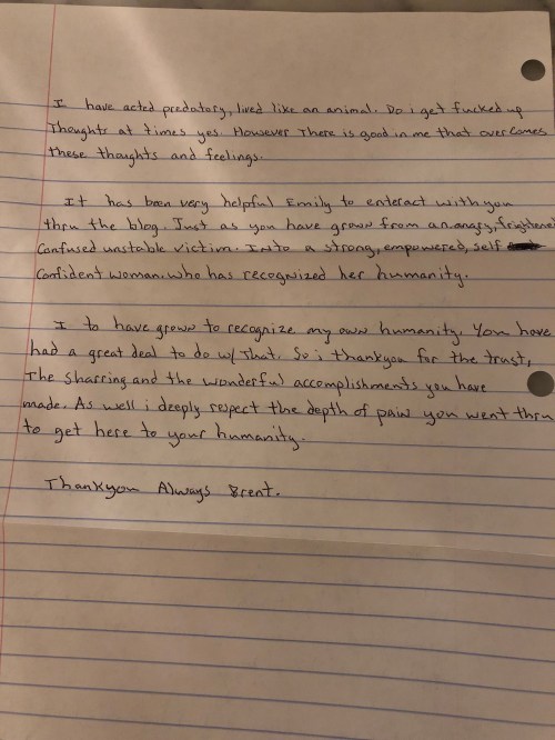 Thank you for your acknowledgement, it means a lot to me. I’d like to acknowledge you for your part in my experiencing freedom from my past. As an example, I recently got to enjoy one of my favourite pastimes: skiing in the mountains. I went with a friend (male) and a friend of his (whom I didn’t know). Before reading the blog and corresponding with you I am certain this would not have happened. Indeed, I’ve refused similar offers before. I would not have allowed myself to stay with two men in this way. As it was, I had the confidence to trust, to be vulnerable and as such they were perfect gentlemen, I had an amazing time, that I wouldn’t otherwise have had. I’m still in the gym training with huge tattooed men, surrounded by banter and I’m progressing… a fortnight ago I deadlifted 100kg and squatted 70kg while listening to Pantera’s Nothing Else Matters. My hard assed coach who was watching, raised his eyebrows and chuckled to himself. I knew I’d arrived…
